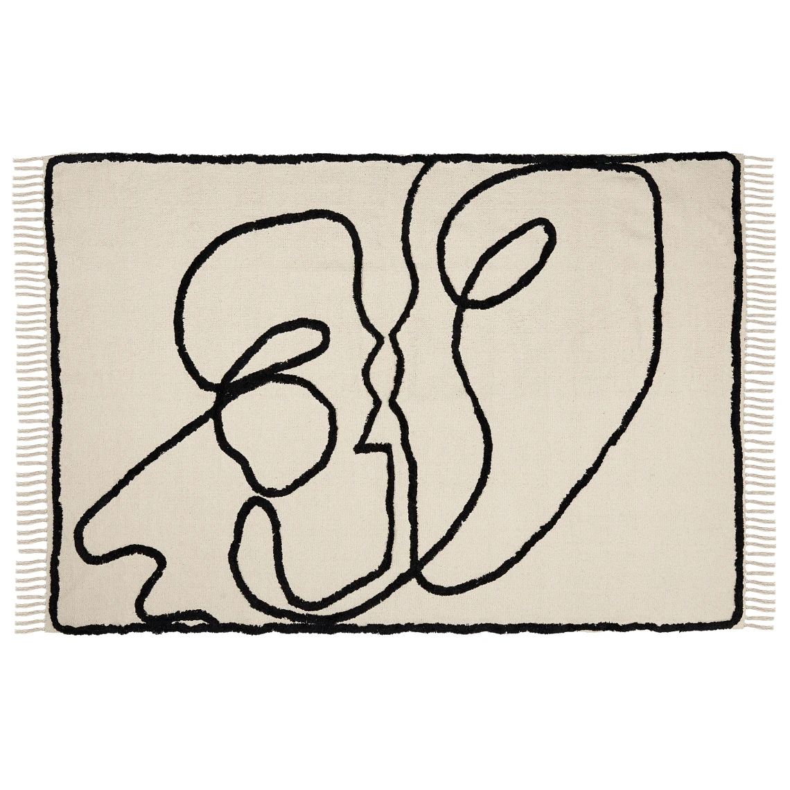 Tapis à franges. Adoptez la beauté de l’art abstrait et laissez cet élégant tapis donner du caractère à votre espace. Avec son motif de visages dessinés au trait, cet accessoire deviendra une pièce maîtresse, quel que soit le style. Complété par des franges sur les deux côtés et dans un ton beige neutre, le tapis s’intégrera parfaitement à tout espace de vie moderne et contemporain. Détails: Type de produit: À poil court Style: Traditionnel Couleur principale: Beige Type de matière: Tissu Matière principale: Coton Matière secondaire: Polyester Composition de la matière: 90% Coton Forme: Rectangulaire Fond anti-glisse: Non Densité: 1200 Motif: Abstrait Convient avec le chauffage au sol: Oui Tissage: Touffeté Dimensions: Hauteur du tapis: 1.3 cm Largeur: 160 cm Longueur: 230 cm Poids: 4.4 kg L`offre inclue: 1 x Tapis Caractéristiques clés: Convient pour le chauffage par le sol, Style intemporel, Un style simple s’adaptant à tout type d’intérieur, Un facteur de confort dans votre intérieur, De haute qualité Informations supplémentaires: Le produit nécessite un certain temps après le déballage pour atteindre sa forme idéale. Nous vous recommandons de le déplier dès que possible, de lui donner jusqu’à 48 heures pour se redresser, ainsi que de mettre un poids lourd sur les extrémités pour un meilleur rendu.