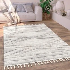 Sans avoir besoin de couleurs vives ou de designs modernes peu harmonieux, les fabuleux tapis de cette collection font entrer quelque de cette collection chose d’extrêmement significatif chez vous : le ralentissement. Avec un charme naturel et discret et des couleurs douces en crème et gris, les accessoires au look boho en vogue enthousiasment et transforment votre pièce préférée en une oasis de vie sans stress, sans pour autant être trop dominants. La surface est ornée de carreaux de différentes tailles et vos pieds sont dorlotés par l’effet haut/bas unique.
